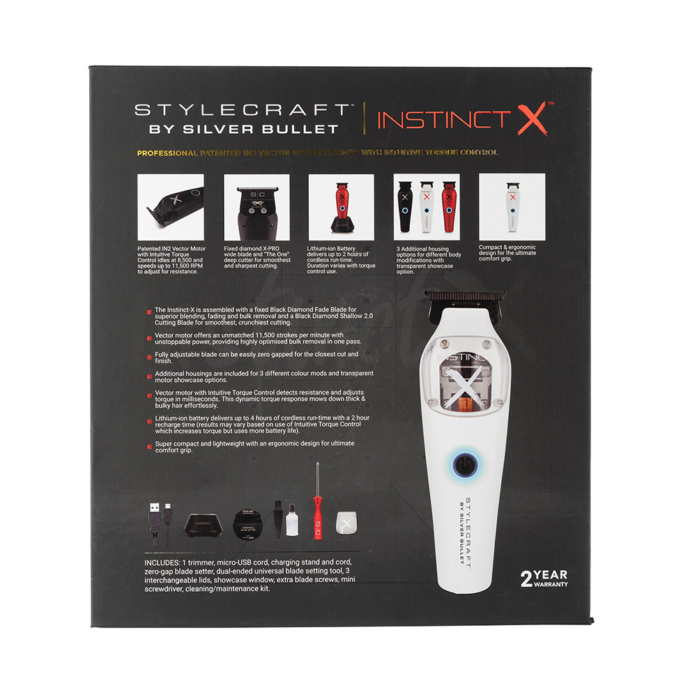 Professional vector motor trimmer with intuitive torque control. StyleCraft by Silver Bullet Instinct X Hair Trimmer combines extreme power with an ergonomically designed, compact and customisable body to deliver unparalleled performance. For professionals who demand nothing less than perfection.